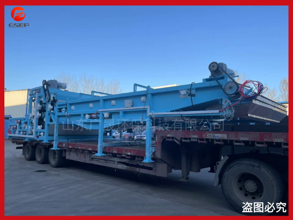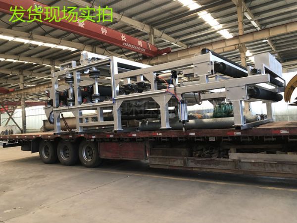 在重力的作用下自由水透过滤网背面而渗出分离,形成不流动状态的泥浆,达到压榨脱水区实施较大压力条件,然后随着网带的移动而夹持在上下两条网带之间,经过具有可调张紧力的过滤带及直径逐渐递减的转辊和对压辊,实施连续增加的缓慢的对辊挤压力、剪切力作用。